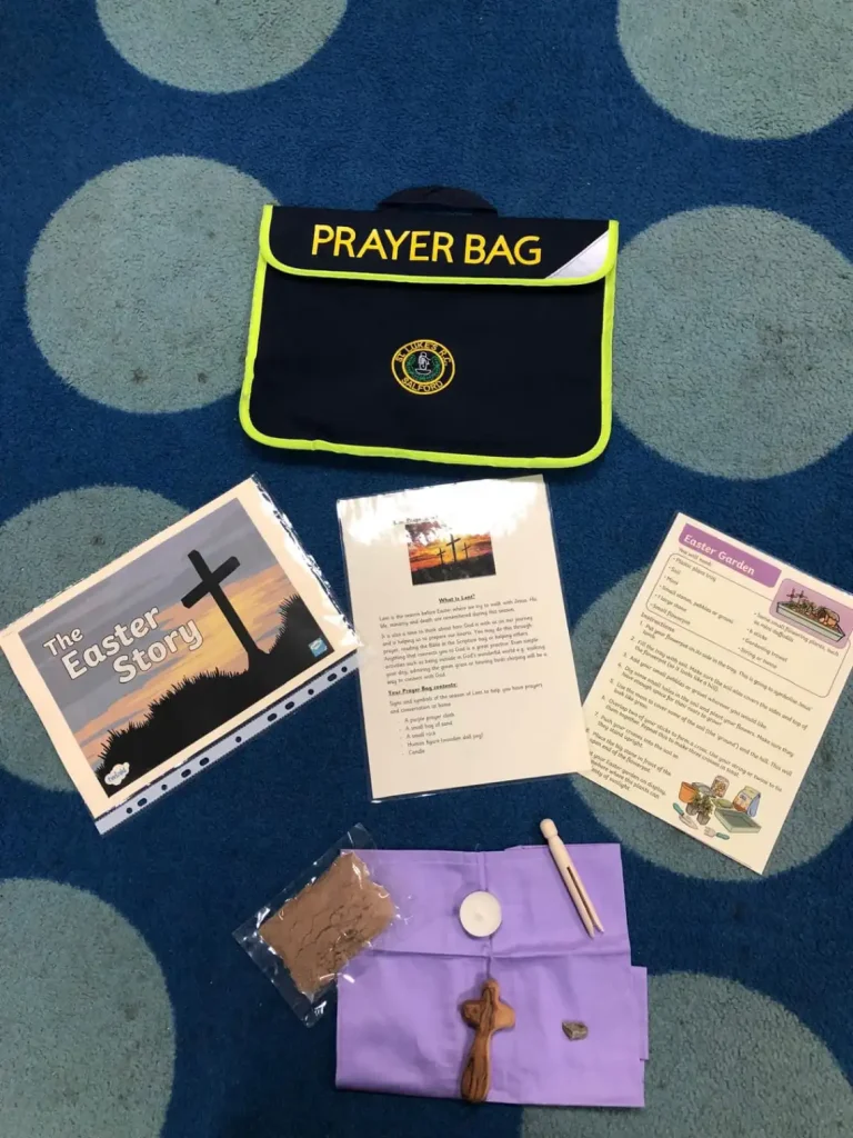 Prayer bags are sent home each evening with a child from each class. The theme of the prayer bags is changed each month or with each liturgical season such as Lent or Advent. The GIFT team work with teachers to put together the prayer bags which contain prayers for you to share and often tokens to hold as you reflect and pray together.
